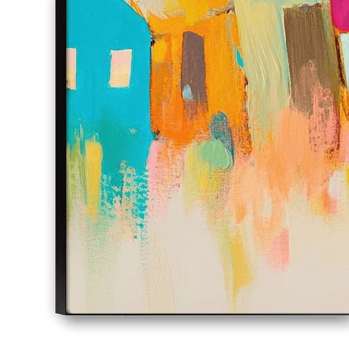 Levendige kleuren en vrolijke vormen komen samen in een harmonieus dorpsgezicht. De levendige huizen in blauw, roze en oranje stralen een uitnodigende warmte uit. Dit kunstwerk brengt een gevoel van joie de vivre en gemeenschap in je woonkamer, waar het fungeert als een gemeenschappelijke blikvanger, die de sfeer verlevendigt en uitnodigt om te blijven hangen.
