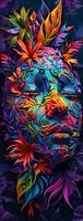 Een dynamisch abstract schilderij met een menselijk gezicht dat ingewikkeld is vermengd met levendige botanische patronen en kleurrijke bladeren.