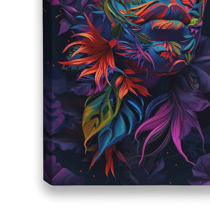 Een dynamisch abstract schilderij met een menselijk gezicht dat ingewikkeld is vermengd met levendige botanische patronen en kleurrijke bladeren.