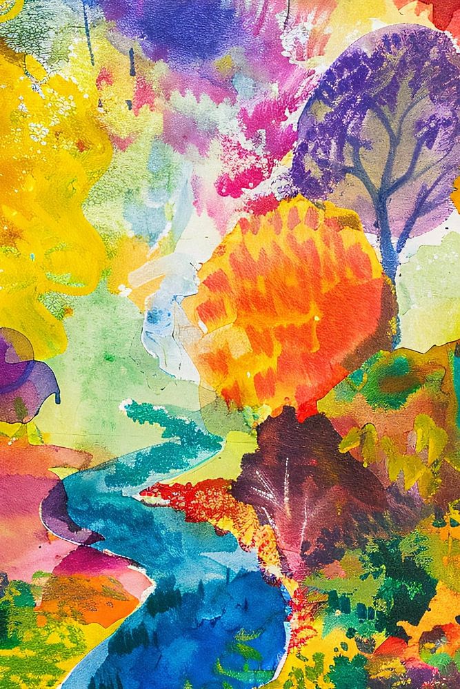 Dit kleurrijke landschap aquarel schilderij brengt een levendige en vrolijke sfeer in elke ruimte. De dynamische mix van kleuren zoals blauw, geel, rood, paars en groen creëert een boeiend visueel spektakel dat je aandacht trekt en je meevoert naar een fantasiewereld vol energie en vreugde. Het schilderij beeldt een prachtig landschap uit, met bomen in verschillende tinten en een sierlijke rivier die door het landschap meandert. Dit kunstwerk is perfect voor diegenen die hun huis willen opvrolijken met een unieke en moderne touch. Het past goed in zowel de woonkamer, slaapkamer als de keuken, en kan een centraal punt van conversatie zijn voor gasten. Voeg een vleugje creativiteit en kleur toe aan je interieur met dit prachtige aquarel schilderij.