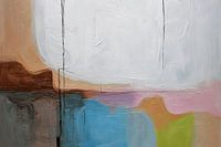 Dit abstracte schilderij combineert heldere kleuren met een opvallende witte bovenlaag, alsof het landschap onder een zachte sluier ligt. De mix van blauw, roze, groen en aardebruin geeft een gelaagd effect dat diepte en contrast toevoegt aan de compositie. Fijne zwarte lijnen breken het oppervlak subtiel open en leiden het oog door het…