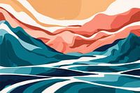 Dit opvallende ontwerp toont een abstract landschap van kleurrijke bergen en een vloeiende rivier. De combinatie van warme oranje en roze tinten boven de bergen met de koelere blauwtinten van het water en de omliggende natuur zorgt voor een levendig maar rustig beeld. Het dynamische lijnenspel tussen de golvende vormen geeft een gevoel van beweging en flow, waardoor het ontwerp ideaal is om sfeer te brengen in elke moderne ruimte. Dit kunstwerk zou prachtig staan in een woonkamer of kantoor, waar het zowel een bron van inspiratie als ontspanning kan zijn. Het kleurrijke contrast maakt het een echte blikvanger die de aandacht trekt zonder te overweldigen.
