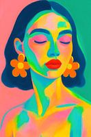 Kleurrijk en modern abstract vrouwenportret met opvallende neonaccenten. Hoogwaardige print op maat – een unieke, trendy blikvanger voor jouw interieur.