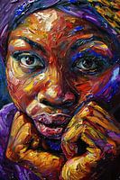 Dit prachtige abstracte schilderij toont het expressieve gezicht van een Afrikaanse vrouw. De levendige kleuren en de gedurfde penseelstreken brengen een dynamische energie naar voren die elke ruimte kan opfleuren. Het intrigerende kleurenspel en de intensiteit in haar ogen trekken onmiddellijk de aandacht van de kijker, waardoor dit kunstwerk een perfecte toevoeging is voor moderne interieurs. Ideaal voor in de slaapkamer of het kantoor, waar het zowel een bron van inspiratie als een stijlvolle decoratie kan zijn. Laat je meevoeren door de emotie en het verhaal dat dit unieke stuk te vertellen heeft.