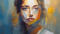 Kalm en intrigerend gelaat komt tevoorschijn uit kleurrijke dikke penseelstreken als een abstracte schets. Open vragende en observerende oogopslag.