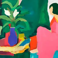 Kleurrijk abstract portret van een anonieme vrouw in een roze jurk met planten en bloemen naast haar. De felle kleuren die ik heb gebruikt bij het maken van dit werk vormen samen een vrolijk geheel.