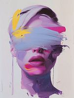 Kleurrijk abstract portret in voornamelijk blauw, roze en geel. Kies zelf het formaat en materiaal bij deze bijzondere blikvanger en maak haar helemaal passend voor jouw interieur.