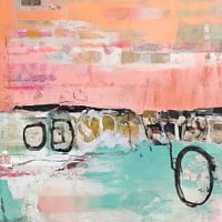 Kleurrijk abstract schilderij, lijnen en vormen. Moderne abstracte lijnen en vormen maken samen een sterke compositie. In roze, blauw, wit en zachtoranje.