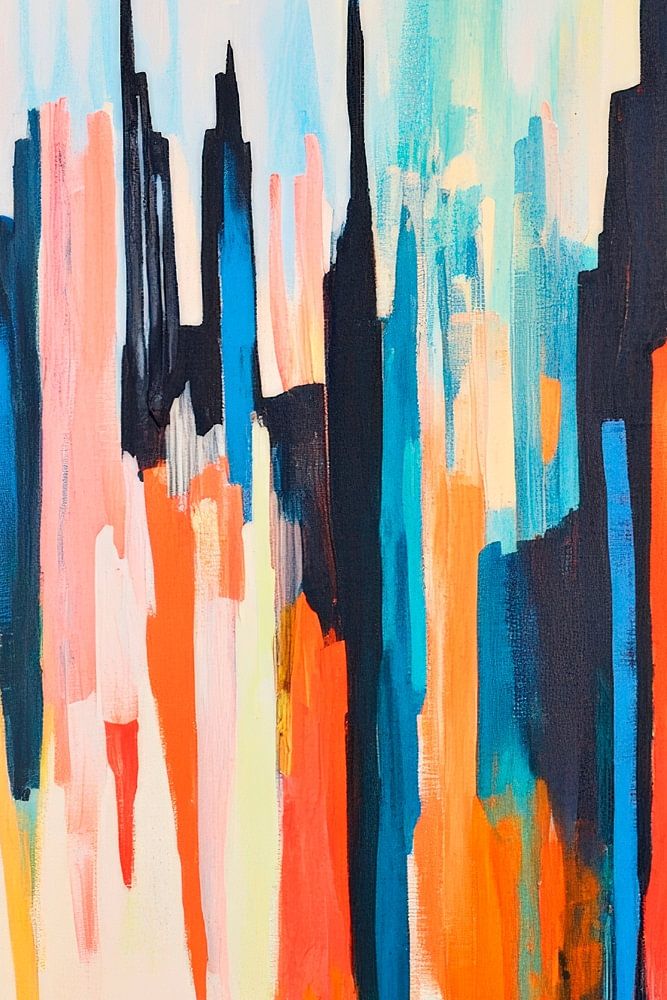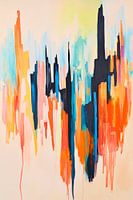 Een fascinerend kleurenspel ontvouwt zich in levendige structuren die doen denken aan een levendig stadslandschap. De zachte overgangen van blauw, oranje en roze trekken de aandacht en creëren een uitnodigende sfeer. Perfect voor de woonkamer om gesprekken te inspireren en creativiteit los te maken.