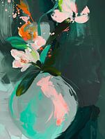 Kleurrijk abstract stilleven met bloemen. In groen, oranje en roze. Modern. Kies zelf het materiaal en formaat bij dit werk en maak het passend voor jouw interieur.