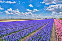 Een Hollands beeld in de lente. Een Kleurrijk bloembollenveld met bloeiende Hyacinten. Paars heeft hier de overhand in dit beeld. De prachtige lucht maakt het geheel compleet.