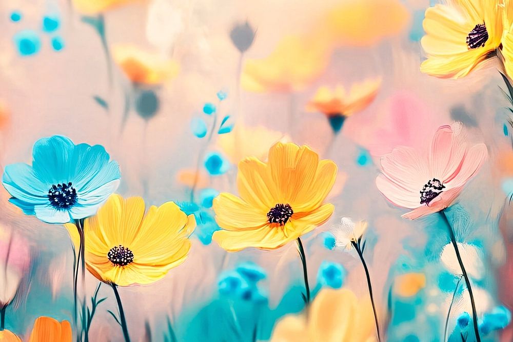 Dit kleurrijke ontwerp straalt een vrolijke en speelse sfeer uit met levendige bloemen in verschillende tinten geel, blauw, roze en oranje. Het beeld lijkt te dansen in de zachte gloed van zonlicht, waardoor het een perfecte keuze is voor ruimtes die warmte en energie nodig hebben. Ideaal voor een slaapkamer, eetkamer of kantoorruimte, dit ontwerp brengt een zomerse ambiance in elke omgeving. Voeg een vleugje kleur en positiviteit toe aan je interieur met dit schitterende bloemendesign!