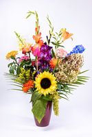 Een stilleven bestaande uit o.a. een zonnebloem, gladiool, roos en een lelie (en meer!) in een donker rode vaas.