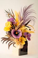 Een artistiek arrangement vol levendige kleuren en fascinerende texturen dat de zintuigen betovert. De zachte paarse tinten harmoniëren perfect met het levendige geel en brengen een vleugje natuur in elke kamer. Ideaal voor in de woonkamer, waar het een gesprek stimuleert en een uitnodigende sfeer creëert.