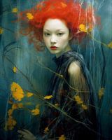 Een bijzonder werk in prachtige complementerende kleuren. Een portret van een jonge vrouw gecombineerd met botanische elementen.