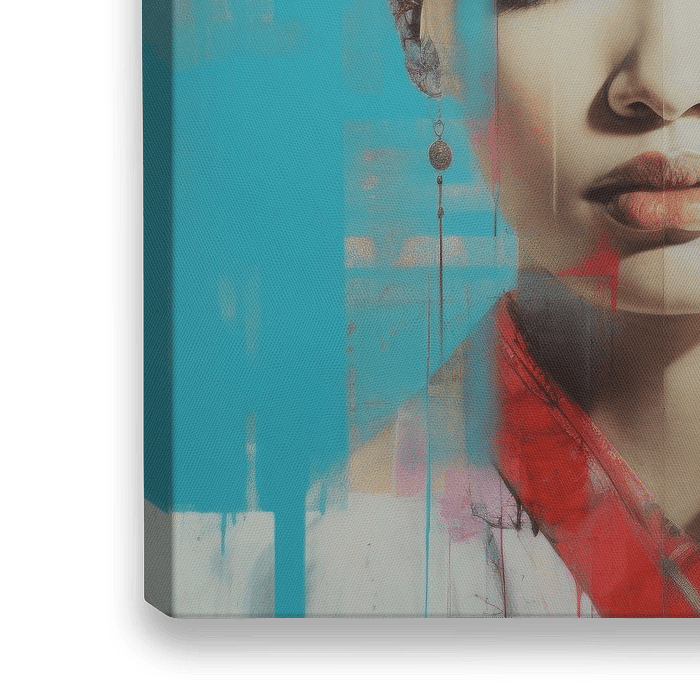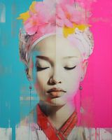 Kleurrijk contemporary art portret in collage stijl. felle kleuren maken van dit werk een echte blikvanger in je interieur. Rood, geel, blauw en roze. Met een vleugje Azië.