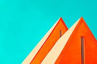 Stijlvolle architectuur ontmoet helder hemelsblauw! De heldere, oranjekleurige dakvlakken met hun opvallende vormen brengen een vleugje joie de vivre en creativiteit in elke kamer. Perfect voor een moderne woonkamer of een inspirerend kantoor, dit kunstwerk creëert een uitnodigende en dynamische sfeer.