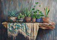 Dit stilleven toont een verzameling van diverse planten, elk geplant in een pot met een unieke, rustieke kleur. De potten, variërend van warme aardetinten tot zachte pastels, hebben een verweerde en ambachtelijke uitstraling, wat bijdraagt aan de authentieke sfeer van het geheel. Ze staan op een robuust stuk oud hout, met diepe nerven en een verweerd oppervlak dat de tijdloosheid van het tafereel benadrukt. De combinatie van levendige planten en de rijke textuur van het hout creëert een harmonieus contrast tussen het organische en het aardse. De natuurlijke kleuren van de potten en de diverse tinten groen van de planten vullen elkaar perfect aan, waardoor het geheel een gevoel van rust en verbondenheid met de natuur uitstraalt.