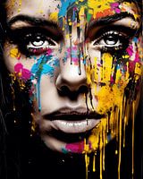 Kleurrijk en bijzonder modern portret, close-up. Deels zwart-wit (het gezicht zelf) en deels vol kleur door de verf die van het gezicht druipt. Digital art, pop art stijl.
