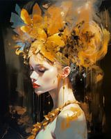 Kleurrijk en modern portret van een jonge vrouw in voornamelijk gele / gouden tinten met veel dynamiek in het beeld door de gebruikte techniek. Prachtig in groot formaat aan je muur!