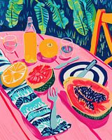 Kleurrijk en modern stilleven van een tafel met fruit. Kies zelf het formaat en materiaal bij dit werk en maak er een echte blikvanger met een zomers tintje van!