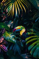 Deze foto laat een prachtige toekan zien, elegant verborgen tussen weelderig groen gebladerte. Zijn opvallende, levendige kleuren - van helder geel tot iriserend rood en groen - springen er sterk uit. De dichte, donkere bladeren vormen een fascinerend contrast dat de schoonheid en charme van deze tropische vogel benadrukt.