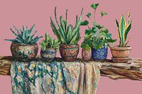 Dit stilleven toont een verzameling van diverse planten, elk geplant in een pot met een unieke, rustieke kleur. De potten, variërend van warme aardetinten tot zachte pastels, hebben een verweerde en ambachtelijke uitstraling, wat bijdraagt aan de authentieke sfeer van het geheel. Ze staan op een robuust stuk oud hout, met diepe nerven en een verweerd oppervlak dat de tijdloosheid van het tafereel benadrukt. De combinatie van levendige planten en de rijke textuur van het hout creëert een harmonieus contrast tussen het organische en het aardse. De natuurlijke kleuren van de potten en de diverse tinten groen van de planten vullen elkaar perfect aan, waardoor het geheel een gevoel van rust en verbondenheid met de natuur uitstraalt. De achtergrond is oud roze.