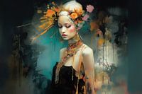 Kleurrijk en toch ingetogen portret van een jonge blonde vrouw met geloken ogen. Bloemen in haar haar, oranje tinten tegen een zwart met blauwe achtergrond.