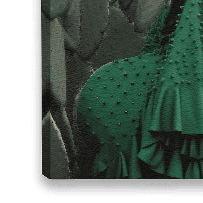 Een bijzonder "fashionable" werk. Een vrouw, volledig in het groen gaat haast op in de achtergrond van cactussen. Voor de liefhebber die echt iets unieks aan de muur wil!