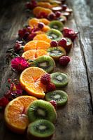 Een betoverend arrangement van sappige sinaasappels, verfrissende kiwi's en helderrode frambozen ontvouwt zich op rustiek hout. De levendige kleuren en natuurlijke schikking nodigen je uit om je zintuigen te verwennen. Dit kunstwerk is perfect voor de keuken of eetkamer en voegt een fruitige frisheid en uitnodigende flair toe aan elke…