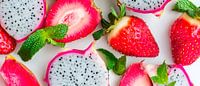 Fruitige kleuren ontvouwen zich in dit arrangement van sappige aardbeien en exotisch drakenvruchtvlees, omlijst door verse muntblaadjes. Deze levendige compositie brengt een vleugje zomer en frisheid in je keuken en inspireert tot culinaire avonturen. Perfect om een uitnodigende sfeer te creëren en als smakelijke blikvanger!