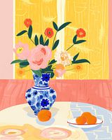 Kleurrijk geïllustreerd stilleven met bloemen. Super vrolijke en speels illustratie die elke ruimte opfleurt. Of je hem nu in de keuken, eetkamer of woonkamer hangt, hier wordt iedereen vrolijk van. In pastelkleuren.