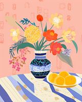 Kleurrijk geïllustreerd stilleven met bloemen. Super vrolijke en speels illustratie die elke ruimte opfleurt. Of je hem nu in de keuken, eetkamer of woonkamer hangt, hier wordt iedereen vrolijk van. In pastelkleuren.