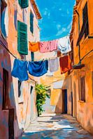De zon kust de kleurrijke waslijnen in een pittoresk steegje waar de tijd lijkt stil te staan. Levendige kleuren harmoniëren met het warme oker van de muren en de heldere lucht, terwijl schaduwen mysterieuze verhalen fluisteren. Dit kunstwerk brengt een vleugje mediterrane levensvreugde in de woonkamer en nodigt je uit om te dromen.