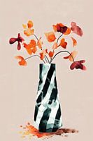 Minimalistisch kleurrijk werk van een lange gestreepte vaas met diagonale lijnen in zwart wit tinten. In de vaas staat een kleurige bos bloemen met herfstige oranje rode tinten.