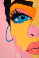 De foto geeft een fascinerende, artistieke look weer die wordt gekenmerkt door levendige kleuren. Vooral opvallend zijn het felblauwe oog, de krachtige wimpers en de harmonieuze combinatie van roze en geel, die het gezicht een moderne, gestileerde touch geeft. De grote lippen en de oorbel ronden de expressieve look af.