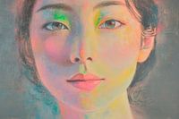 Een fascinerend portret dat speelt met zachte, levendige kleuren en de gratie van het gezicht benadrukt. De expressieve ogen stralen een diepe rust uit, terwijl delicate kleurovergangen een dromerige sfeer creëren. Ideaal voor de slaapkamer, creëert een harmonieuze, inspirerende omgeving en nodigt uit tot reflectie en ontspanning.