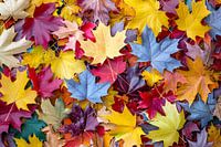 Breng de sfeer van de herfst in huis met deze prachtige foto van gekleurde bladeren op de grond. Perfect voor op een koude dag!