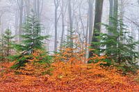 Prachtige opname op een mistige ochtend van een bos met kale bomen, oranje struiken en groene dennen in het Roekelse bos bij de Hoge Veluwe in de herfst