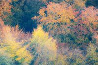Abstracte bewerking van een foto van een bos met verschillend gekleurde bomen. De herfstkleuren geven het schilderachtige werk een warme uitstraling.