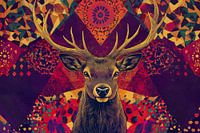 Dit prachtige ontwerp toont een majestueus hert, omringd door een levendig en gedetailleerd patroon in gedurfde kleuren. De achtergrond is rijk aan abstracte vormen en kleuren zoals rood, oranje, paars en geel, wat een dynamisch en energiek geheel creëert. Dit ontwerp past perfect in een modern interieur dat graag opvalt, bijvoorbeeld in een woonkamer of eetkamer. De combinatie van de dieren- en abstracte stijl maakt het ideaal voor liefhebbers van eclectische en kleurrijke kunst. Het hert, een symbool van kracht en elegantie, springt er echt uit in dit visueel opvallende ontwerp, wat een warme en artistieke sfeer toevoegt aan iedere ruimte.