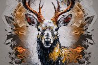 Dit prachtige kunstwerk toont een hert, afgebeeld in een abstracte, expressieve stijl. De dynamische penseelstreken en levendige kleuren, waaronder tinten oranje, wit en bruin, creëren een levendig beeld dat de aandacht trekt. Het gewei van het hert is bijzonder opvallend, met rijke details die een gevoel van kracht en mysterie oproepen. Dit ontwerp zou prachtig passen in moderne interieurs, vooral in ruimten zoals een kantoor of slaapkamer waar een visueel opvallend element gewenst is. De combinatie van het natuurlijke onderwerp met een abstracte kunststijl maakt dit werk zowel fascinerend als tijdloos. Het is ideaal voor liefhebbers van zowel dieren als eigentijdse kunst.