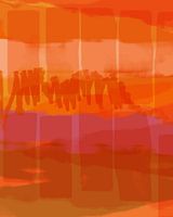 Kleurrijk landschapschilderij in heldere warme neon- en pastelkleuren.