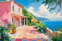 Een roze huis ligt schilderachtig aan een kustlijn, omringd door weelderig groen en bloeiende planten. De kleurrijke vloer trekt op magische wijze de aandacht, terwijl zachte golven in de verte glinsteren. Wolken dansen in de lucht en geven het tafereel een dromerige lichtheid die uitnodigt tot vakantie en ontspannen momenten.