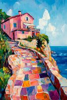 Een levendig kleurenspel trekt het oog naar een betoverend roze huis dat trots op een steile klif staat. Het schitterende stenen pad kronkelt in zachte bochten, terwijl de golven van de zee vrolijk tegen de rotsen kletteren. Wolken drijven zachtjes boven de helderblauwe lucht en geven het tafereel een dromerige lichtheid.