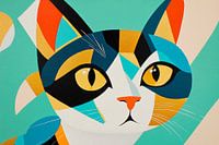 Een levendig samenspel van geometrische vormen en heldere kleuren brengt het portret van een expressieve kat tot leven. Zijn grote, nieuwsgierige ogen en contrasterende vachtpatronen creëren een uitnodigende en speelse sfeer. Dit kunstwerk is perfect voor in de woonkamer, waar het de kijker kan betoveren met zijn charmante blik.
