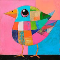 Een vrolijke, kleurrijke vogel laat zijn kleurenvreugde los in een speels web van geometrische patronen. Met zijn grote, glinsterende ogen en stevige lijf straalt hij levendigheid uit, terwijl de harmonieuze combinatie van felle kleuren en zachte achtergronden een betoverende sfeer creëert. Een vrolijke blikvanger die vreugde en creativiteit belichaamt!