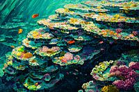 Breng een vleugje magie en kleur in je interieur met deze levendige afbeelding van een onderwaterwereld. Het ontwerp toont een prachtig koraalrif in sprankelende tinten van blauw, roze en geel, gecombineerd met sierlijke vissen die de scène tot leven brengen. Perfect als blikvanger voor elke ruimte, dit kunstwerk roept een gevoel van rust en verwondering op. Ideaal voor liefhebbers van natuur en abstracte kunst!