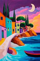 Levendige kleuren en dromerige landschappen smelten samen in dit landschap, waar zachte golven de kust kussen en glanzende huizen je uitnodigen om te blijven hangen. De harmonieuze sfeer onder een mysterieuze maan straalt rust en inspiratie uit - perfect voor een creatieve hoek in de woonkamer waar dromen en creativiteit tot bloei kunnen komen.