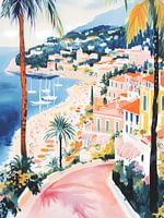 Een bruisend kustplaatsje badend in zonlicht, met palmbomen, kleurrijke huizen en sprankelend blauw water. Dit kunstwerk legt de onbezorgde sfeer van een perfect zomervakantiegevoel vast en brengt warmte in elke ruimte.